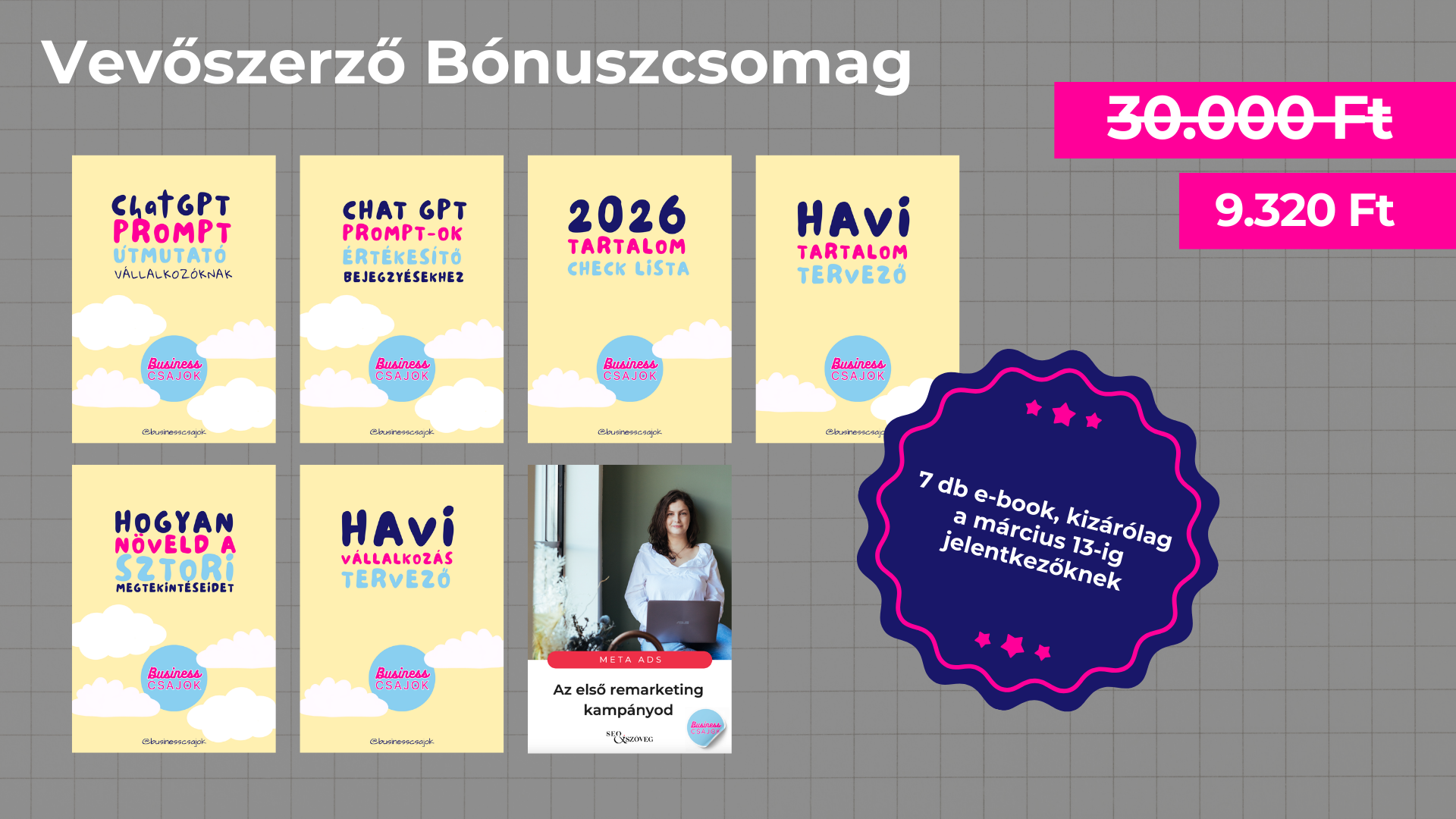 • 6 hetes, csoportos Vevőszerző Mentorprogram, 70.000 Ft értékben.